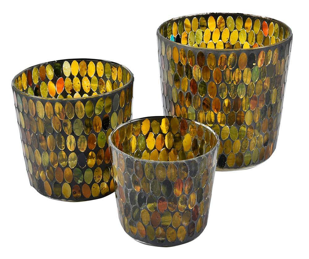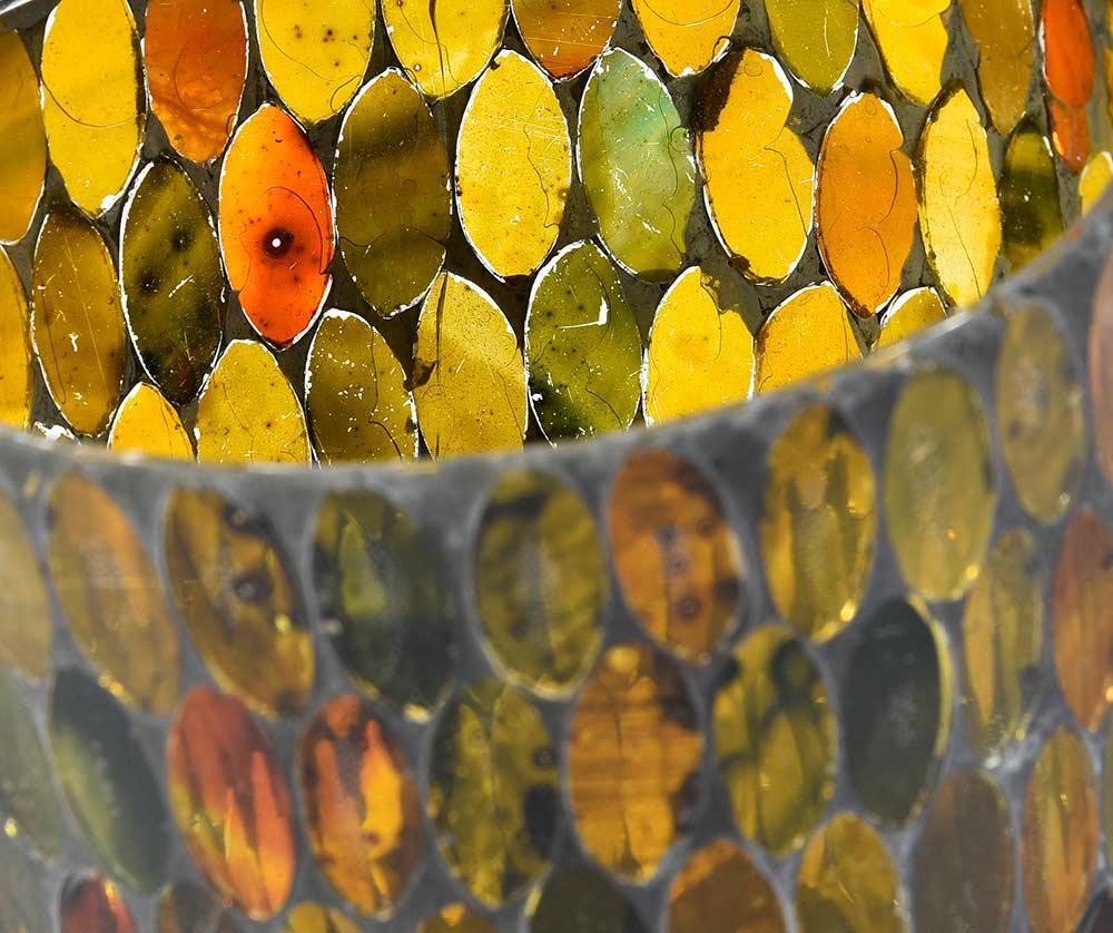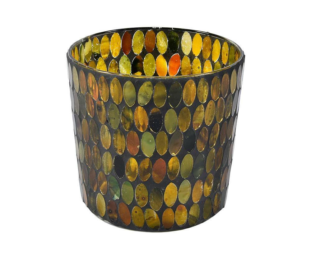 Szklany lampion na świecę typu t-light. Idealny by ozdobić pusty blat komody czy wypełnić miejsce na regale. Światło odbijające się w mozaikowym szkle podkreśla bursztynowo zielony kolor. Zapalone w lampionie świeczki podkreślą wyjątkowy, wieczorowy nastrój. Dekoracja sama w sobie jest niebanalnym elementem aranżacyjnym, może być świecznikiem a także pełnić rolę wazonika na niewielkie kwiaty. Kilka zestawionych z sobą z pewnością przykuje wzrok.